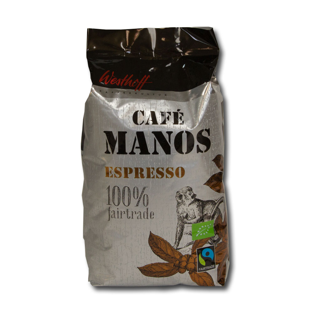 Rassig und edel, das ist Westhoff Café Manos Espresso Fairtrade. Feinste Provenienzen, die bewusste Auswahl der Rohkaffees und die traditionelle italienische Röstmethode ergeben einen ausgesprochen kräftigen Espresso mit sanftem Charakter und feinporiger Crema, die den Charme dieses vollendeten